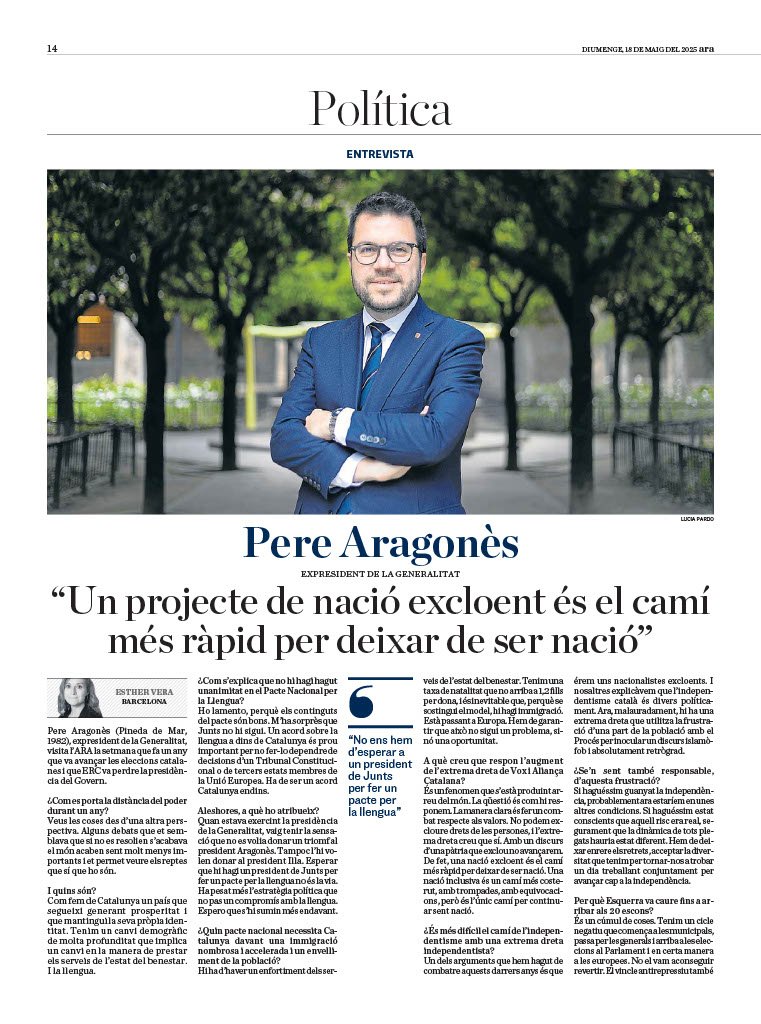 Entrevista al expresident Pere Aragonés, publicat al diari ARA, 2025